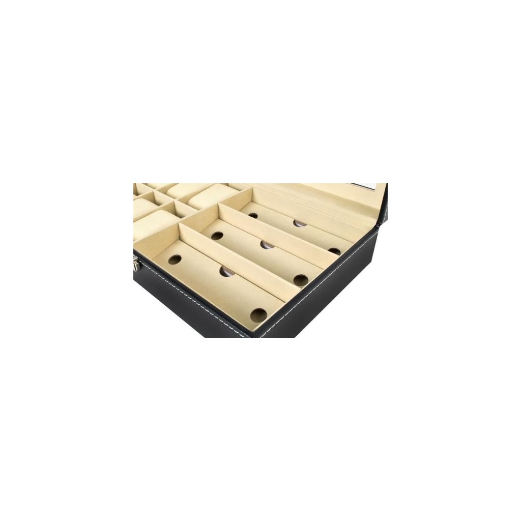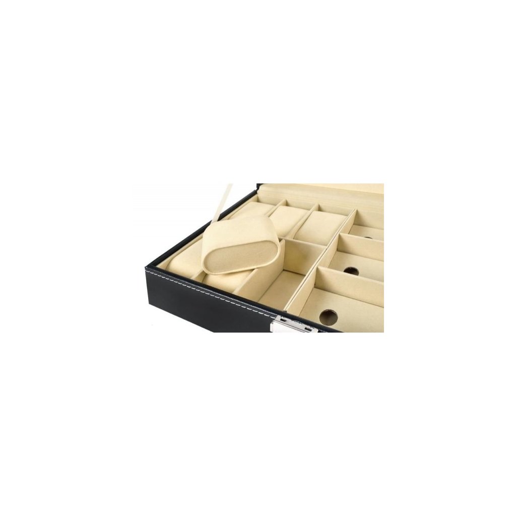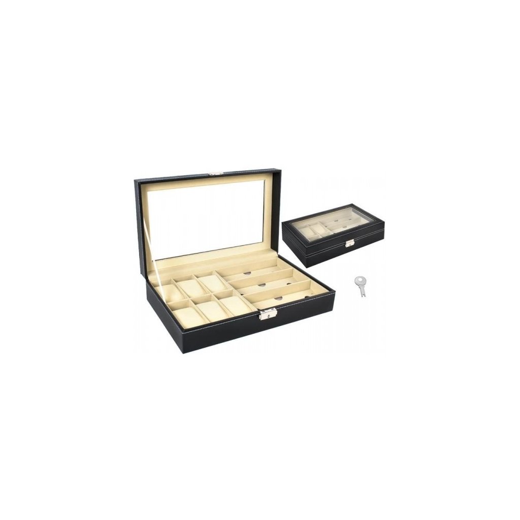 Kovová západka znamená, že organizér sa náhodne neotvorí a jeho obsah pri prenášaní nevypadne. Vaše šperky v nej budú v bezpečí. Súprava je navyše dodávaná s kľúčom, ktorý umožňuje úplné zatvorenie organizéra a chráni pred inými osobami. Organizér je vyrobený s dôrazom na detail, krásne vyzerá a svoj obsah skvele zobrazuje. Výrobok je vyrobený z čiernej ekokože s bielym prešívaním a svetlý, dokonale kontrastný interiér. Veko púzdra je priehľadné, vďaka čomu možno box na hodinky a okuliare využiť nielen na uloženie a udržiavanie poriadku, ale aj na elegantné vystavenie obsahu. Vnútro organizéra je vystlané mäkkým materiálom, vďaka vankúšikom sú doplnky chránené proti poškriabaniu, každý z nich je vyberateľný, vďaka čomu tam môžeme uložiť aj iné šperky, napr.náramky, prívesky, prstene alebo náušnice. Priehradky sú oddelené vyššími stenami, čo chráni uložené príslušenstvo pred nežiaducim kontaktom, ktorý by mohol mať za následok poškodenie. Je vhodný nielen na uloženie hodiniek a okuliarov, ale aj náramkov a iných šperkov, preto bude perfektným darčekom pre ženy aj mužov. Je praktický a dokonale zapadne do každého interiéru a určite bude hitom každého.