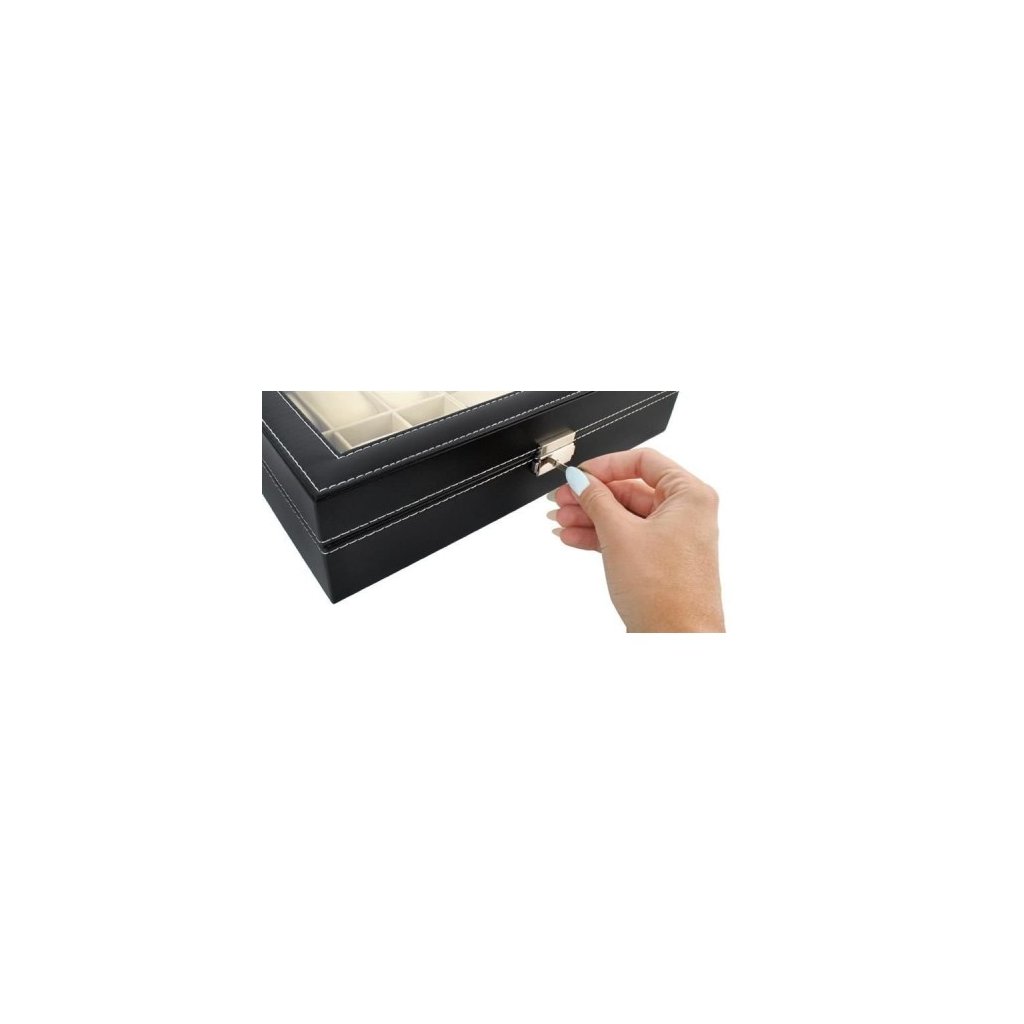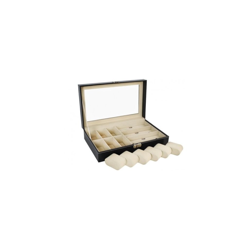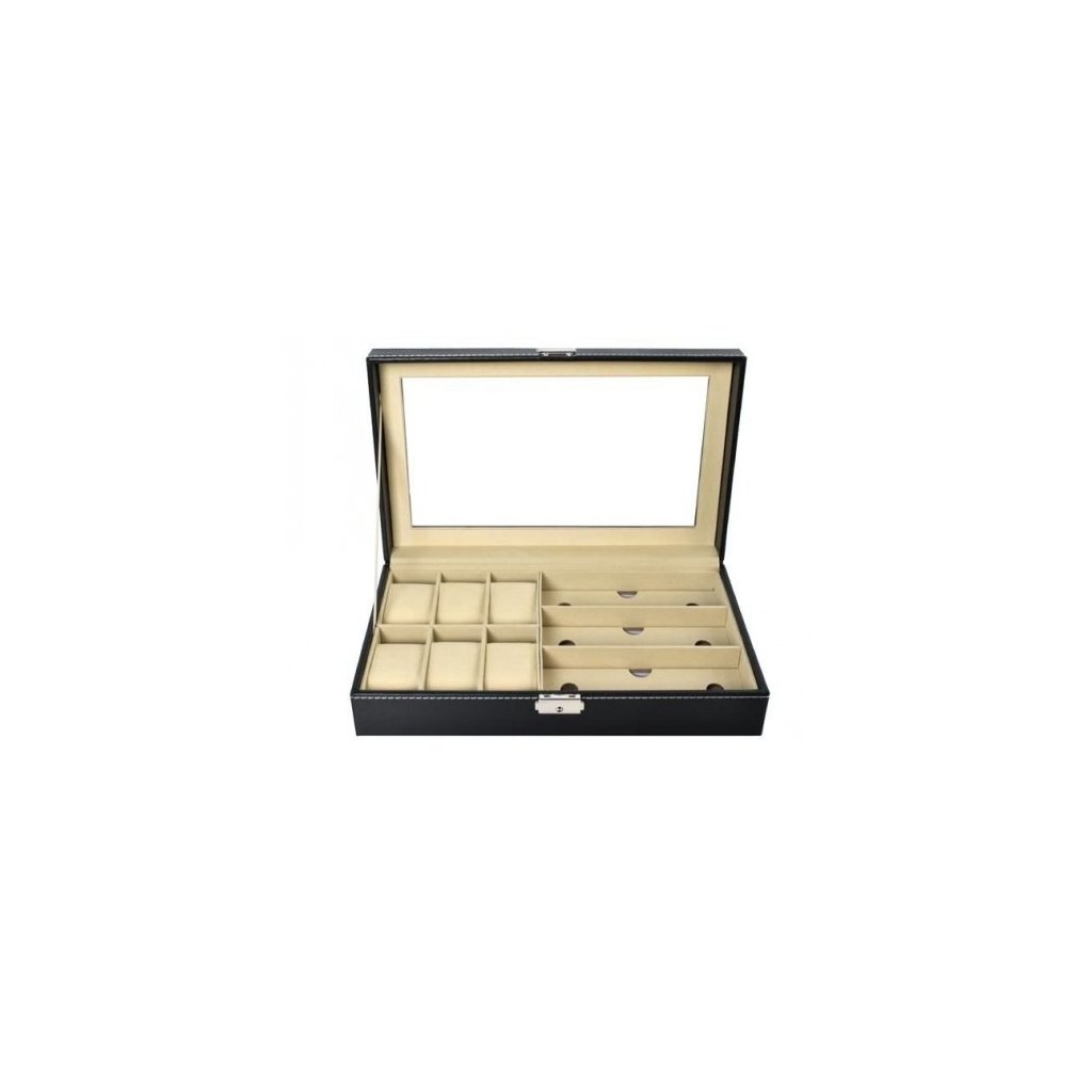 Kovová západka znamená, že organizér sa náhodne neotvorí a jeho obsah pri prenášaní nevypadne. Vaše šperky v nej budú v bezpečí. Súprava je navyše dodávaná s kľúčom, ktorý umožňuje úplné zatvorenie organizéra a chráni pred inými osobami. Organizér je vyrobený s dôrazom na detail, krásne vyzerá a svoj obsah skvele zobrazuje. Výrobok je vyrobený z čiernej ekokože s bielym prešívaním a svetlý, dokonale kontrastný interiér. Veko púzdra je priehľadné, vďaka čomu možno box na hodinky a okuliare využiť nielen na uloženie a udržiavanie poriadku, ale aj na elegantné vystavenie obsahu. Vnútro organizéra je vystlané mäkkým materiálom, vďaka vankúšikom sú doplnky chránené proti poškriabaniu, každý z nich je vyberateľný, vďaka čomu tam môžeme uložiť aj iné šperky, napr.náramky, prívesky, prstene alebo náušnice. Priehradky sú oddelené vyššími stenami, čo chráni uložené príslušenstvo pred nežiaducim kontaktom, ktorý by mohol mať za následok poškodenie. Je vhodný nielen na uloženie hodiniek a okuliarov, ale aj náramkov a iných šperkov, preto bude perfektným darčekom pre ženy aj mužov. Je praktický a dokonale zapadne do každého interiéru a určite bude hitom každého.