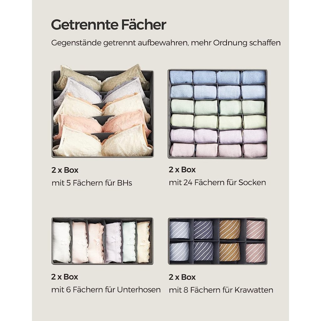 Vďaka týmto 8 úložným boxom už nemusíte hekticky vraziť do chaotickej zásuvky v šatníku. Vďaka našej sade organizérov– 2 skladacie boxy s 5 priehradkami na podprsenky, 2 boxy so 6 priehradkami na šály alebo spodky, 2 boxy s 8 priehradkami na kravaty a 2 boxy s 24 priehradkami na ponožky alebo iné doplnky zabezpečia poriadok a prehľad vo vašich veciach. Vďaka týmto skladacím boxom z vylepšenej netkanej textílie a robustných švov sa konečne rozlúčte s nekvalitnými boxmi; vaše podprsenky a spodky si zaslúžia lepšie miesto na uloženie. Vďaka vyberateľným bočným doskám a zipsu v spodnej časti môžete boxy rýchlo postaviť; pri sťahovaní ich možno jednoducho zložiť a uložiť.