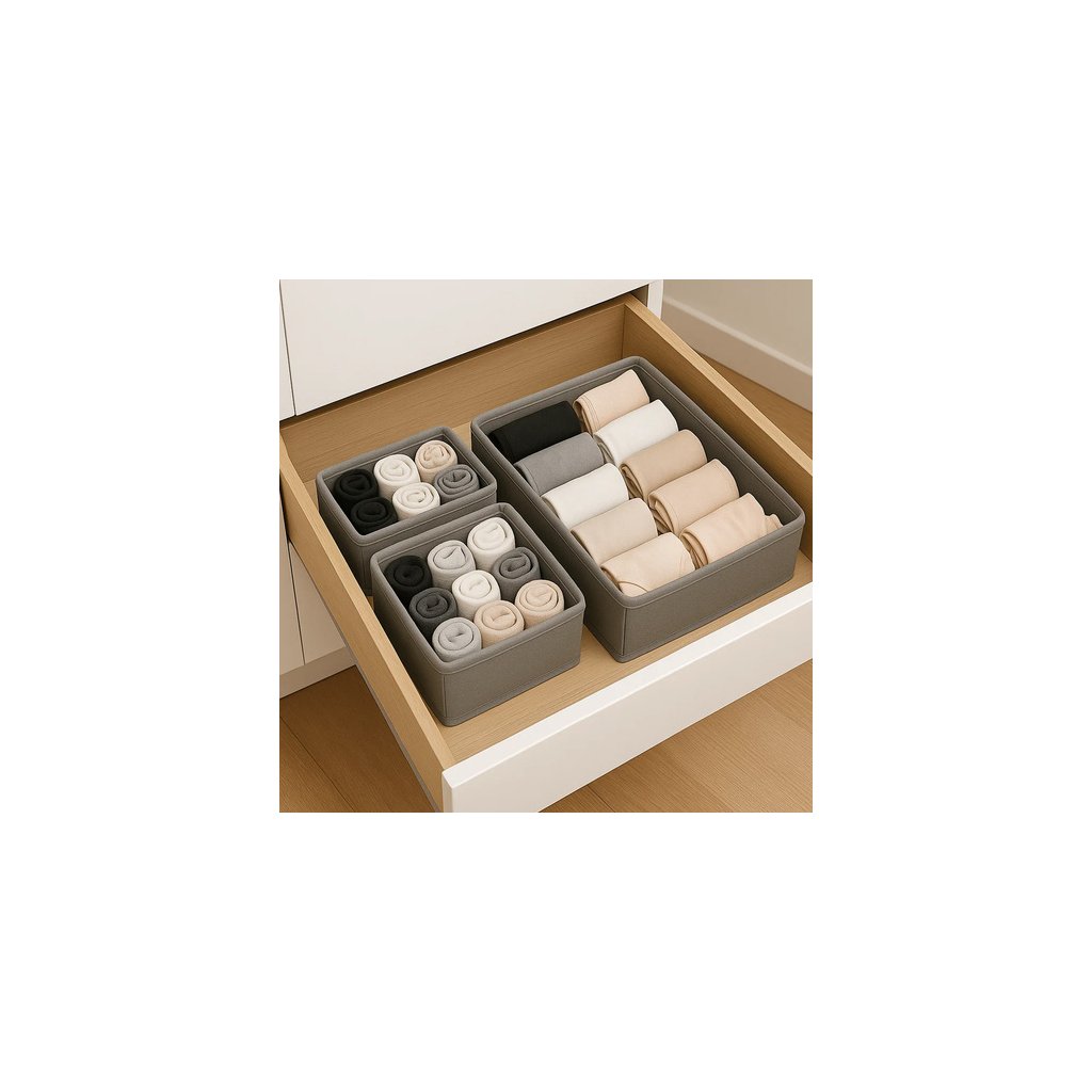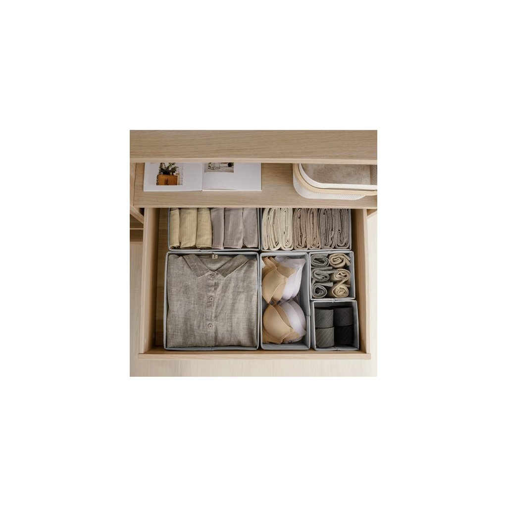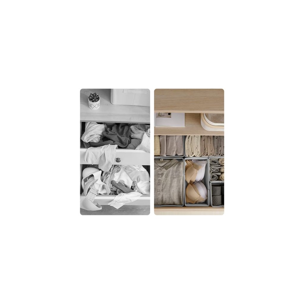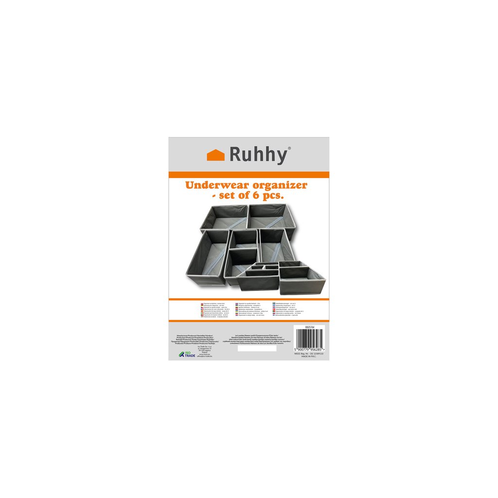 Ruhhy organizér na spodnú bielizeň je praktická sada určená na organizáciu spodnej bielizne, ponožiek, podprseniek či kravát. Sada obsahuje 6 skladacích organizérov rôznej veľkostí, čo umožňuje efektívne usporiadanie rôznych druhov bielizne.