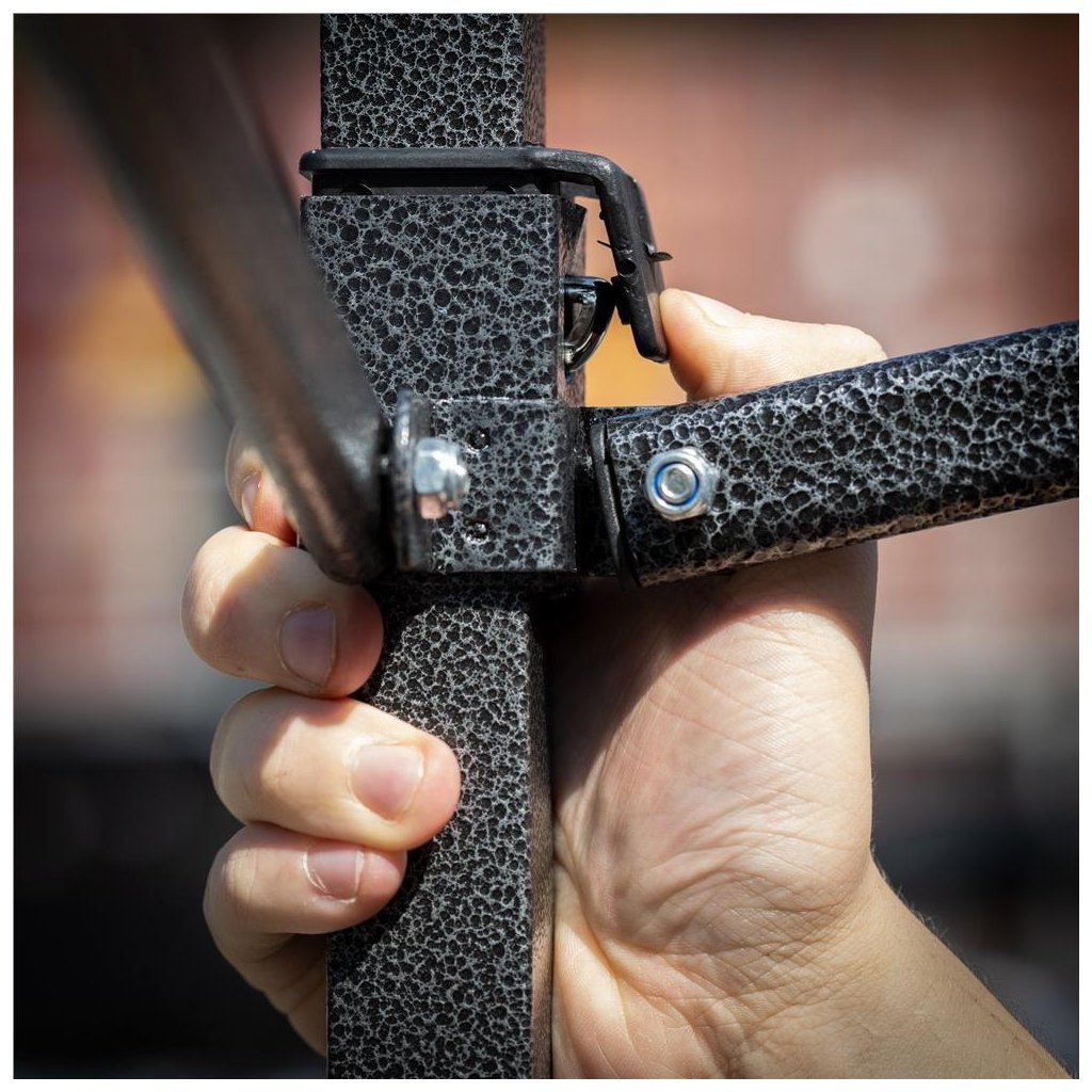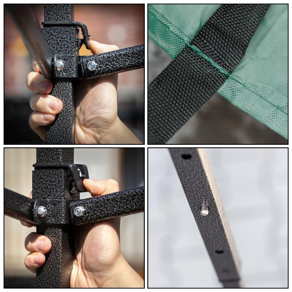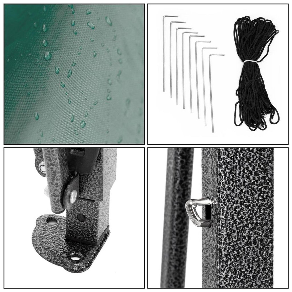 Robustný oceľový rám s antikoróznou úpravou zabezpečuje pevnosť a stabilitu stanu, vďaka čomu je vhodný na pravidelné používanie počas celej sezóny. Strecha a tri bočné steny sú vyrobené z odolnej 420D Oxford tkaniny s hydrofóbnym náterom, ktorá bráni prenikaniu vody a poskytuje príjemný tieň. Zeleno-čierne prevedenie pôsobí elegantne a prirodzene, takže dokonale zapadne do záhrad, parkov či mestských priestorov.