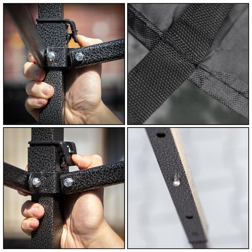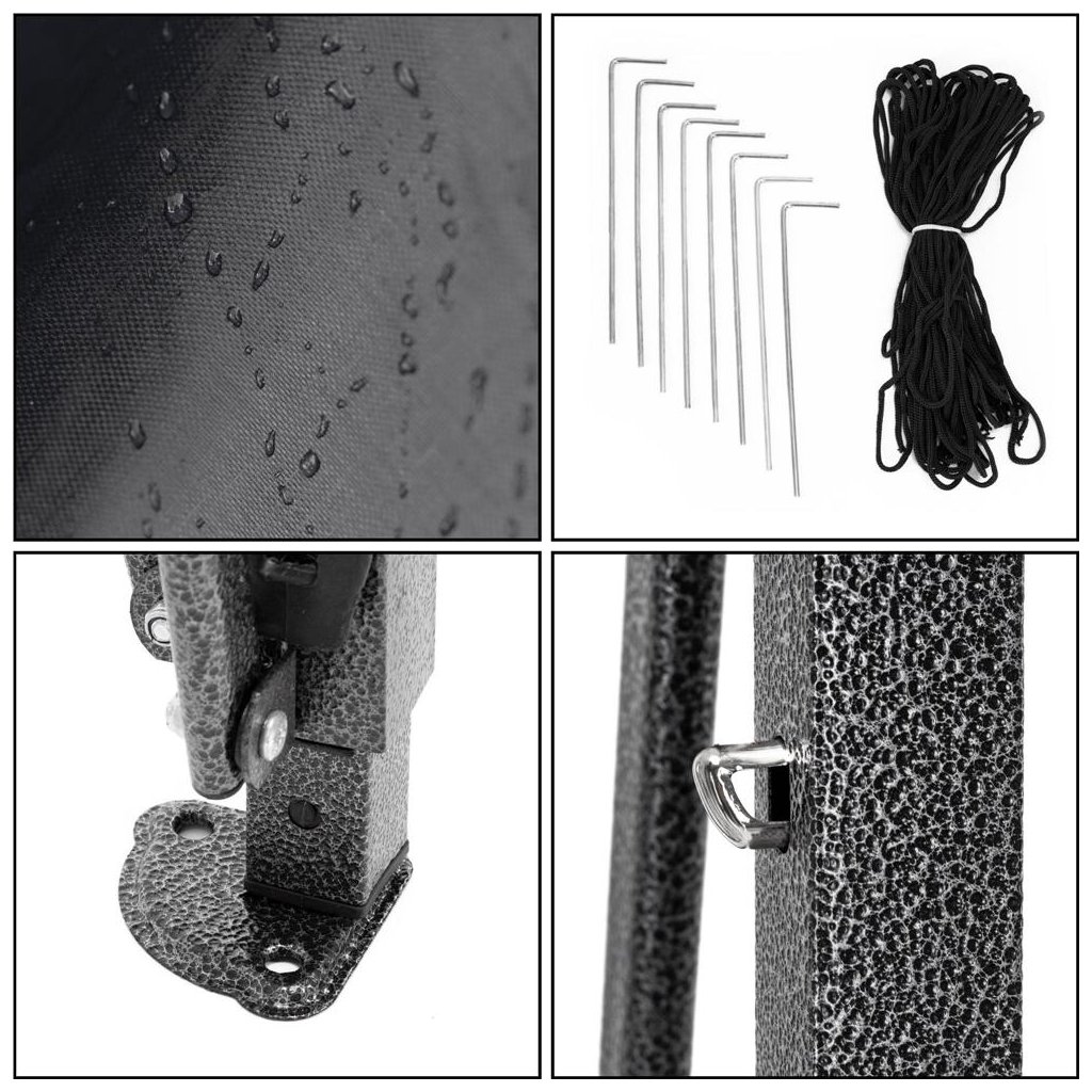 Robustná oceľová konštrukcia s antikoróznou úpravou zaručuje dlhú životnosť a stabilitu aj pri pravidelnom používaní. Strecha a bočné steny sú vyrobené z kvalitnej 420D Oxford tkaniny s hydrofóbnym povrchom, ktorá poskytuje účinnú ochranu pred slnkom aj miernym dažďom. Elegantné sivé prevedenie sa štýlovo hodí do každého prostredia – od mestských priestorov až po záhrady a parky.