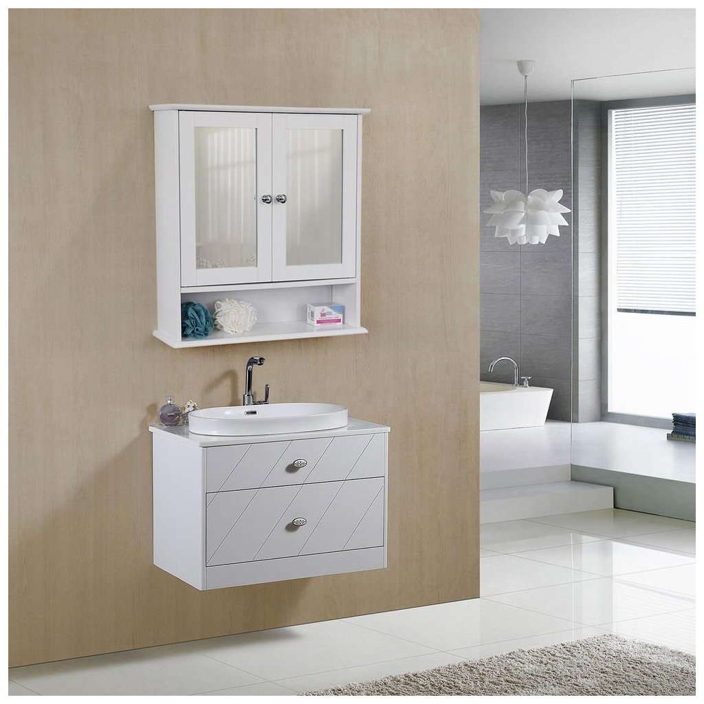 Skrinka je vybavená dvojkrídlovými dvierkami so zabudovanými obdĺžnikovými zrkadlami, ktoré vám poslúžia pri každodennej hygiene a úprave zovňajšku.