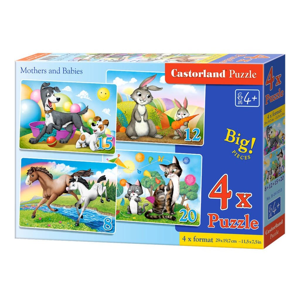 Castorland 4-v-1 Contour Puzzle – Mamičky a bábätká je ideálne puzzle pre najmenšie deti. Sada obsahuje 4 samostatné obrázky s postupne rastúcou náročnosťou (8, 12, 15 a 20 dielikov), vďaka čomu sa dieťa môže učiť skladať krok za krokom.
