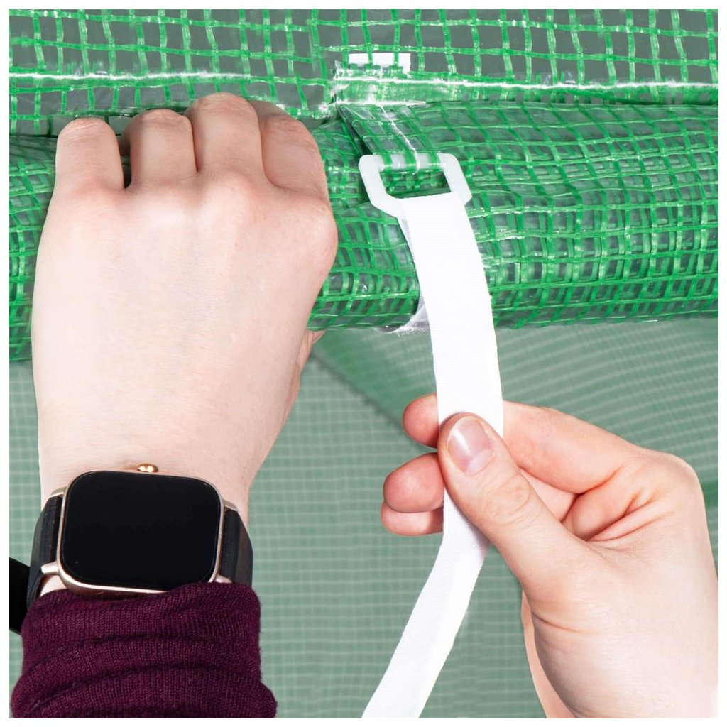 - Pohodlné popruhy na suchý zips - vďaka ktorým môžete fóliové dvierka pohodlne zrolovať, čo uľahčí pohodlný vstup a výstup do tunelov, ako aj dostatočný prístup vzduchu a svetla pre rastliny rastúce vo vnútri