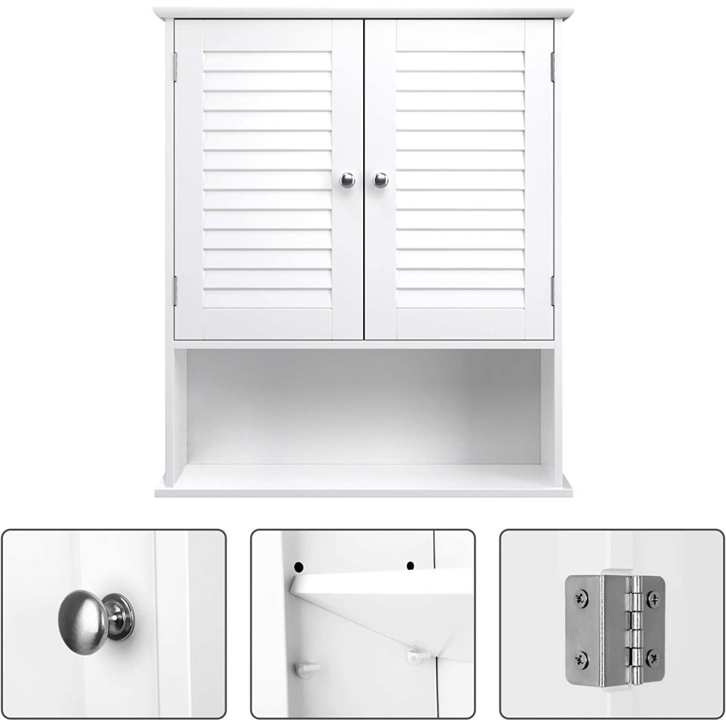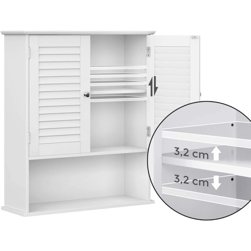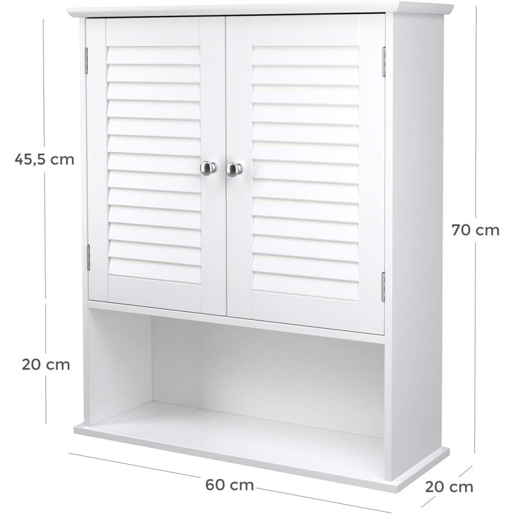 Toaletné potreby, výrobky na starostlivosť o vlasy, flakóny s parfumom - táto nástenná skrinka s rozmermi 60 x 20 x 70 cm vám pomôže usporiadať tieto predmety na jednom mieste a mať ich stále na blízku. Jednoduchá, ale moderná kúpeľňová skrinka, doplnená dizajnom dvojitých zatváracích dverí, s elegantným telom z MDF triedy E1 a 2 pochrómovanými kovovými rúčkami, dokonale zapadne do vašej kúpeľne, obývacej izby, vchodu alebo do akejkoľvek inej miestnosti. Vnútorná polica má 5 výškových nastavení, aby uspokojila vaše potreby.