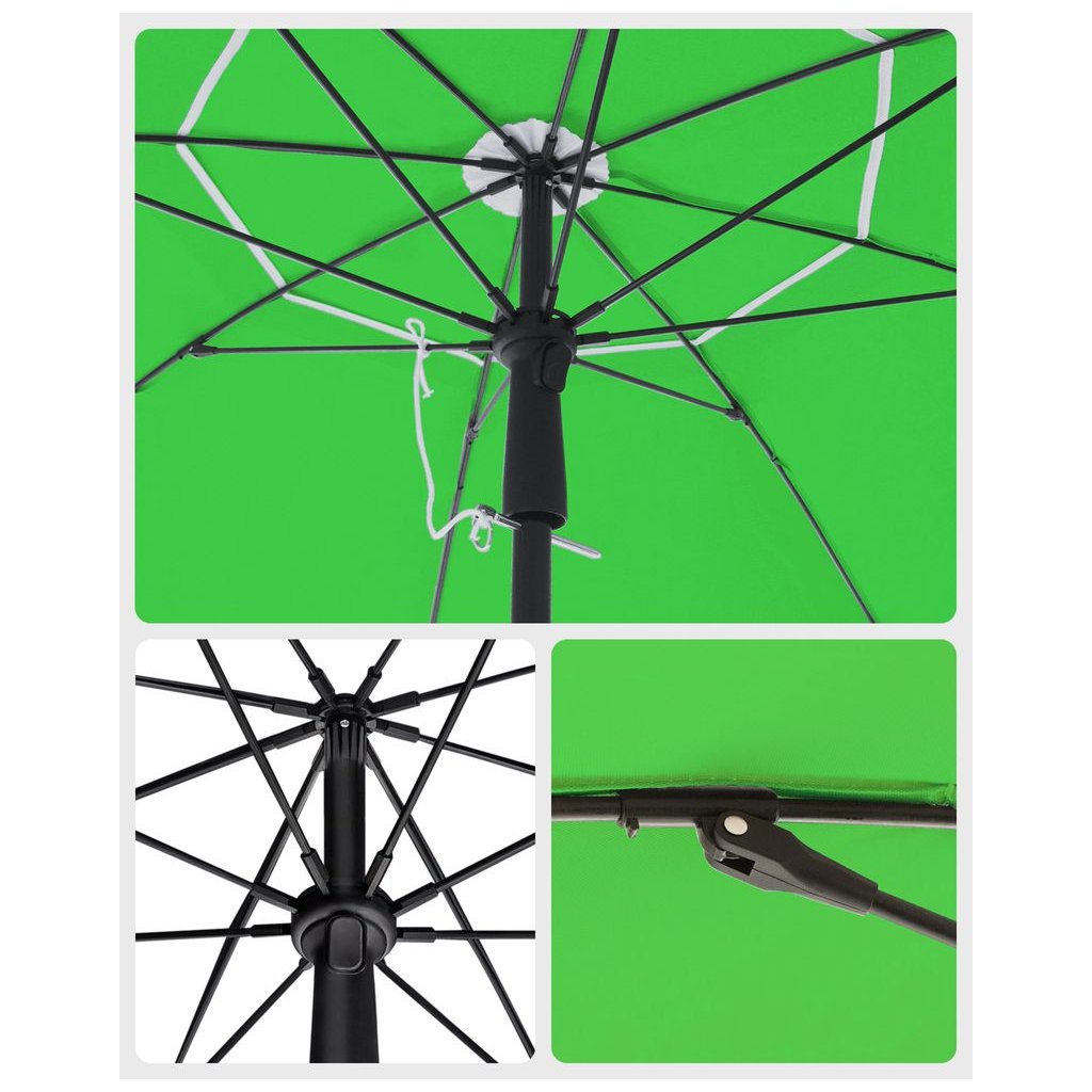Vetrací otvor v hornej časti umožňuje lepšiu cirkuláciu vzduchu a znižuje tlak vetra, zatiaľ čo rebrá zo sklenených vlákien zabezpečujú stabilitu a dlhú životnosť slnečníka.