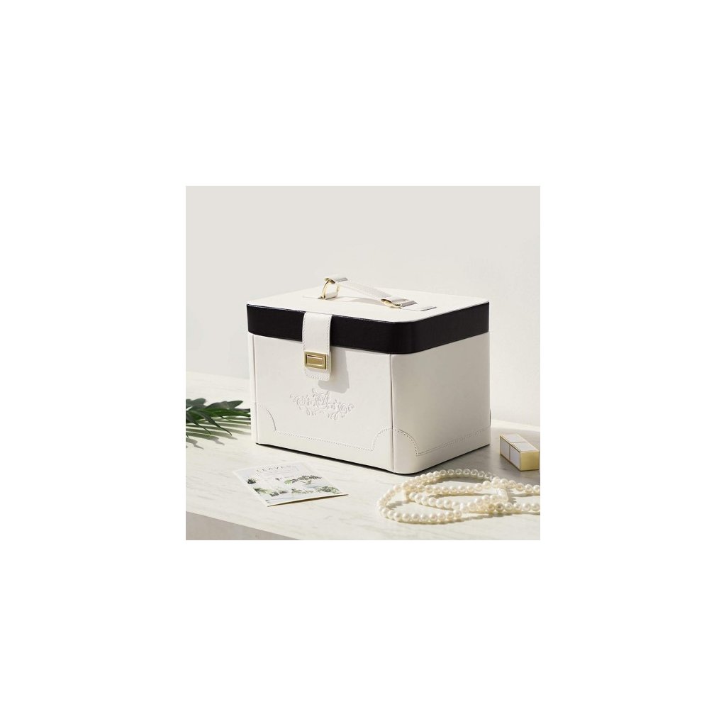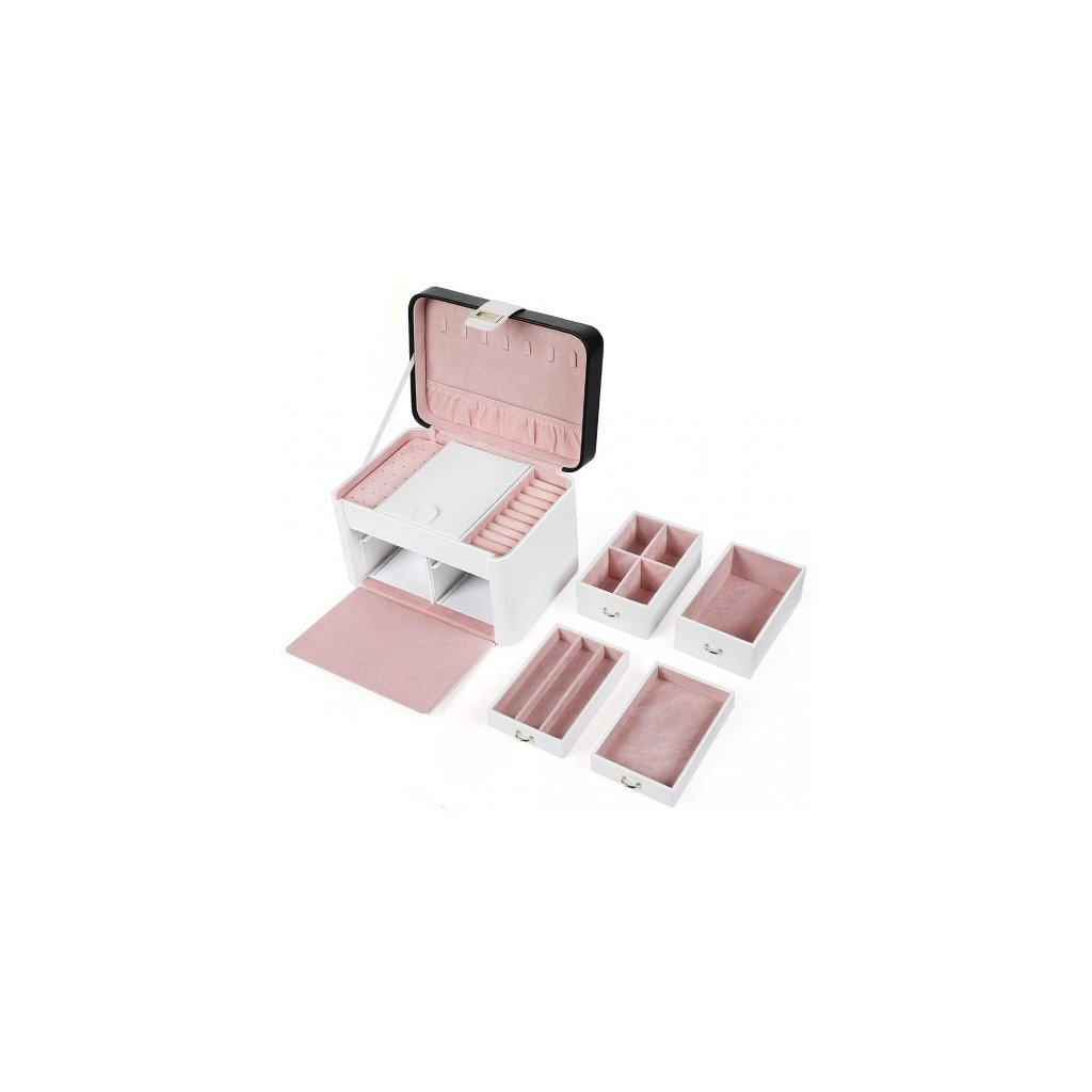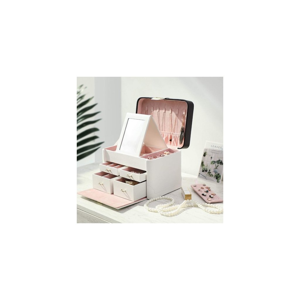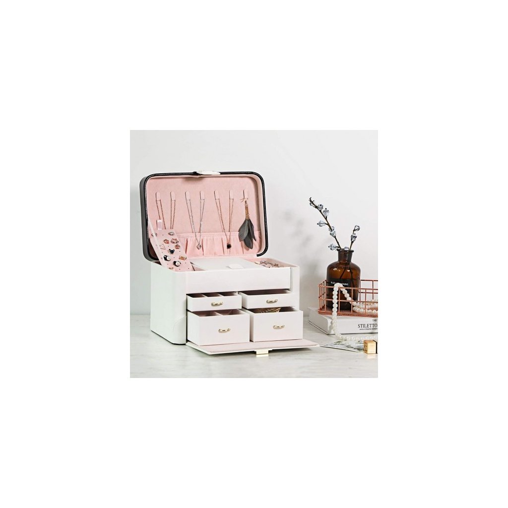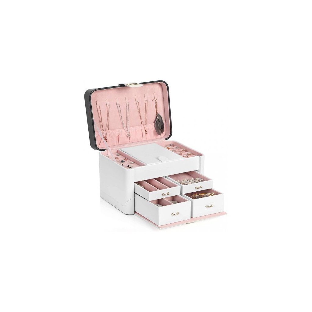 Šperkovnica SONGMICS udržuje všetky Vaše poklady pokope a v poriadku, aby ste mohli vyzerať krásne každý deň. Na veku šperkovnice sa nachádza 7 háčikov na retiazky a 1 úložné vrecko. Na vrchnej časti šperkovnice sa okrem zrkadla nachádza aj 10 slotov na prstene a miesto na naušnice. 4 zásuvky slúžia ako organizér na náramky, hodinky, brošne a iné. Táto exkluzívna šperkovnica s výsuvným zrkadlom poteší každú ženu.
