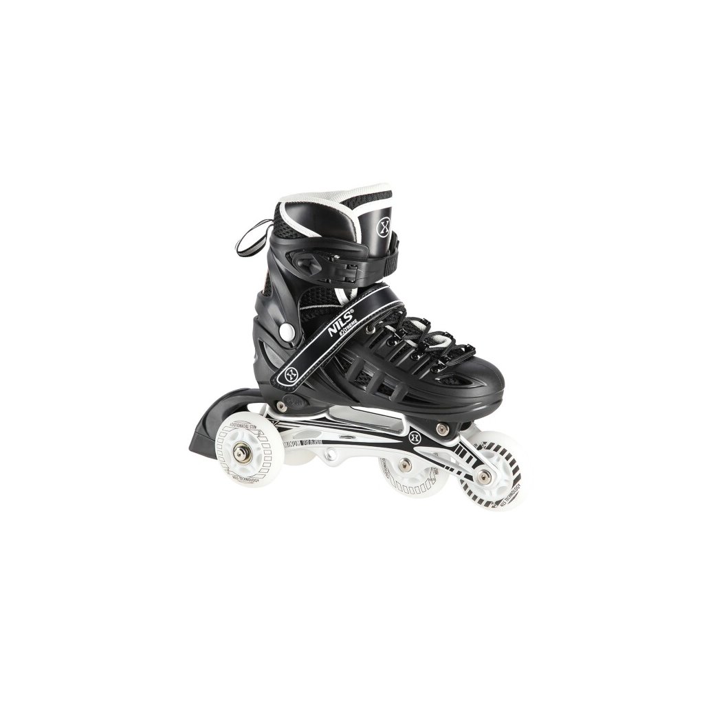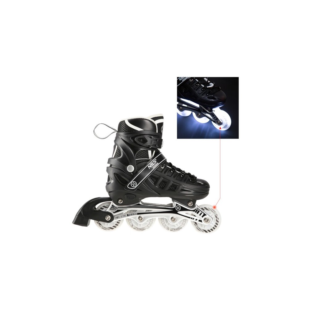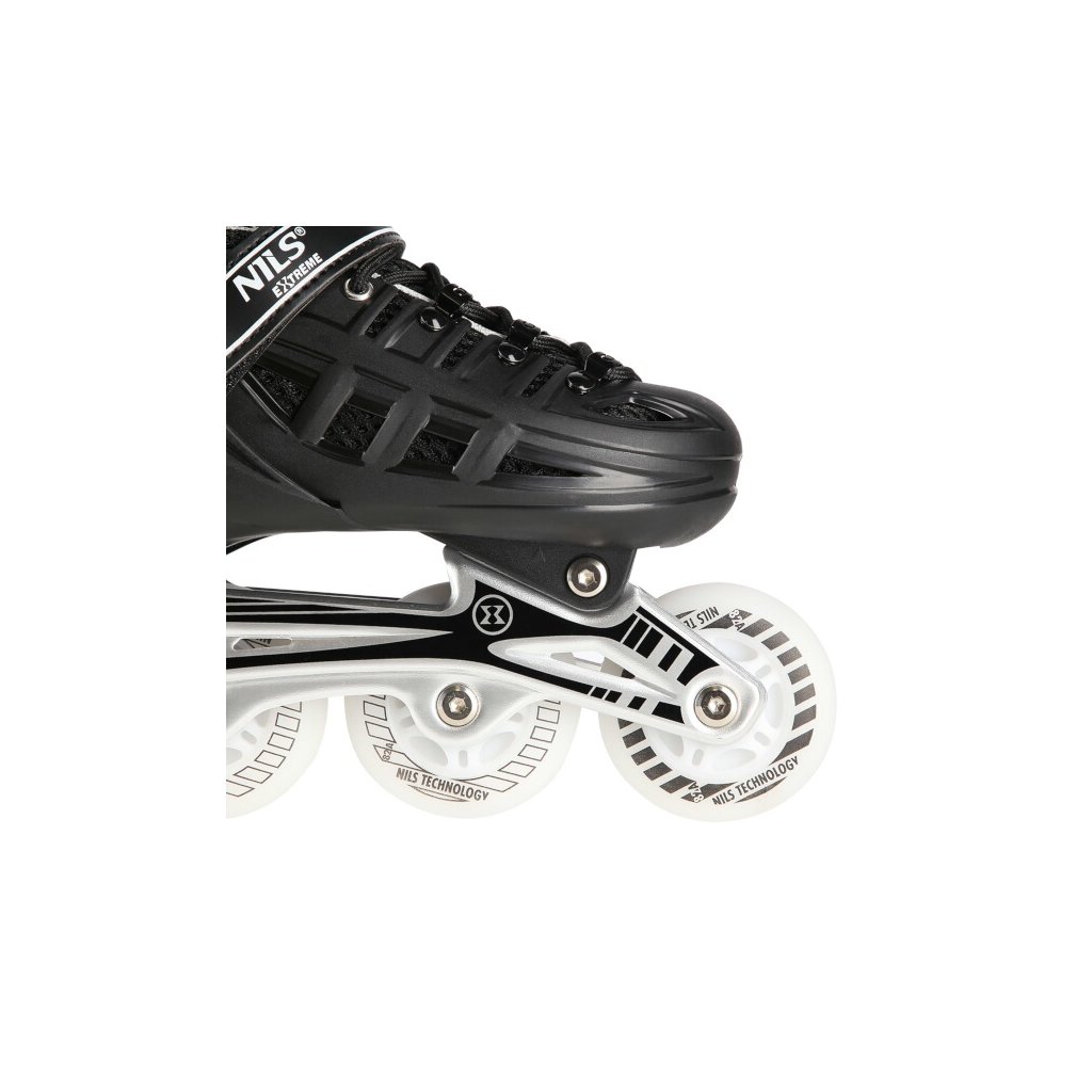 NILS Extreme NH10905 je obľúbená súprava korčúľ s variabilným podvozkom, svietiacimi kolieskami a nožom na ľad. 2. generácia prináša nový svieži vzhľad korčúľ. HN10905 je určená pre začiatočníkov a pokročilých korčuliarov. Škrupina korčule z tvrdého plastu má tvrdú špičku a vetracie otvory pre lepšie prúdenie vzduchu cez vnútornú topánku. Vnútornú topánku tvorí sieťovina, priedušná membrána, 8 milimetrov hustej peny a EVA. Zapínanie korčule tvorí klasická trojkombinácia: šnurovanie, pásik na suchý zips a dvojdielna pracka. Pod pätou sa nachádza tlačidlo na zmenu veľkosti korčule. Po stlačení tlačidla možno posunúť špičku topánky a nastaviť tak jednu zo 4 veľkostí. Tento systém umožňuje prispôsobiť veľkosť nohe a slúži ako "rastúca" obuv, ktorá rastie spolu s detskou nohou a zároveň znižuje výslednú cenu korčúľ. Rám je vyrobený z hliníka a sú v ňom vložené 4 polyuretánové kolieska s LED diódami, ktoré sa pri otáčaní rozsvietia. Kolieska sú vybavené ložiskami ABEC 7, ktoré sú ideálnym kompromisom pre mierne pokročilých korčuliarov. Z výroby sú kolesá uložené v rade (in-line) a súčasťou dodávky je sada skrutiek a podložiek na nastavenie kolies na usporiadanie 2+2 a 2+1+1. Nôž na ľad je vyrobený z vysoko uhlíkovej nehrdzavejúcej ocele.