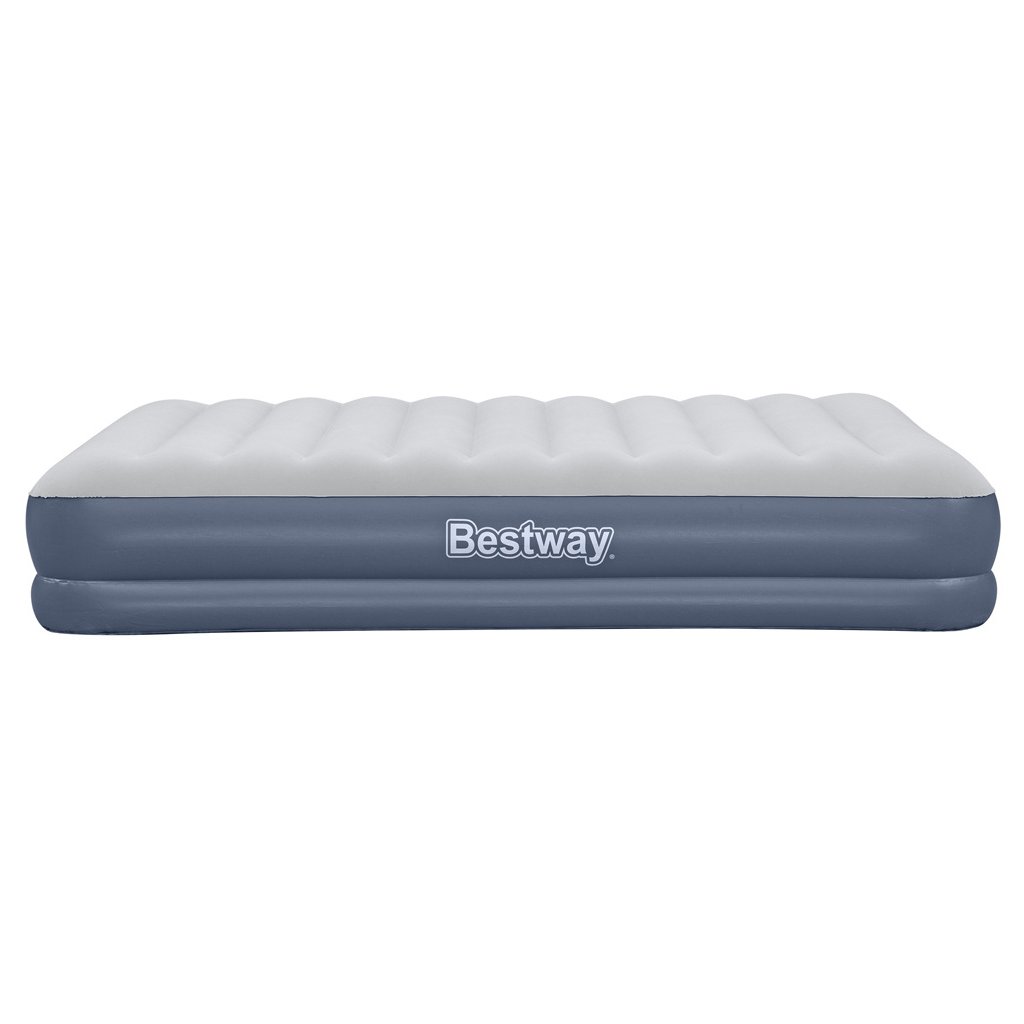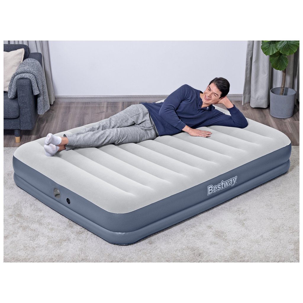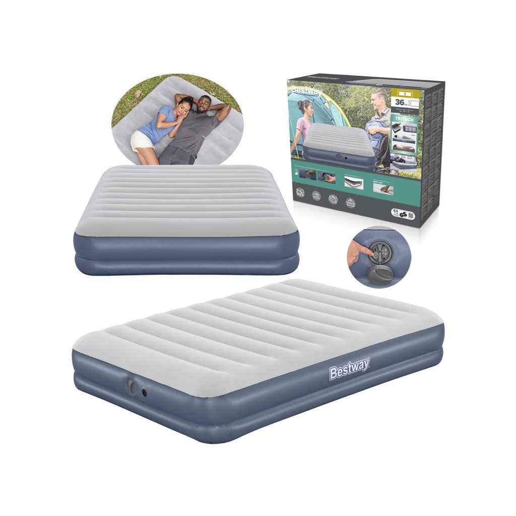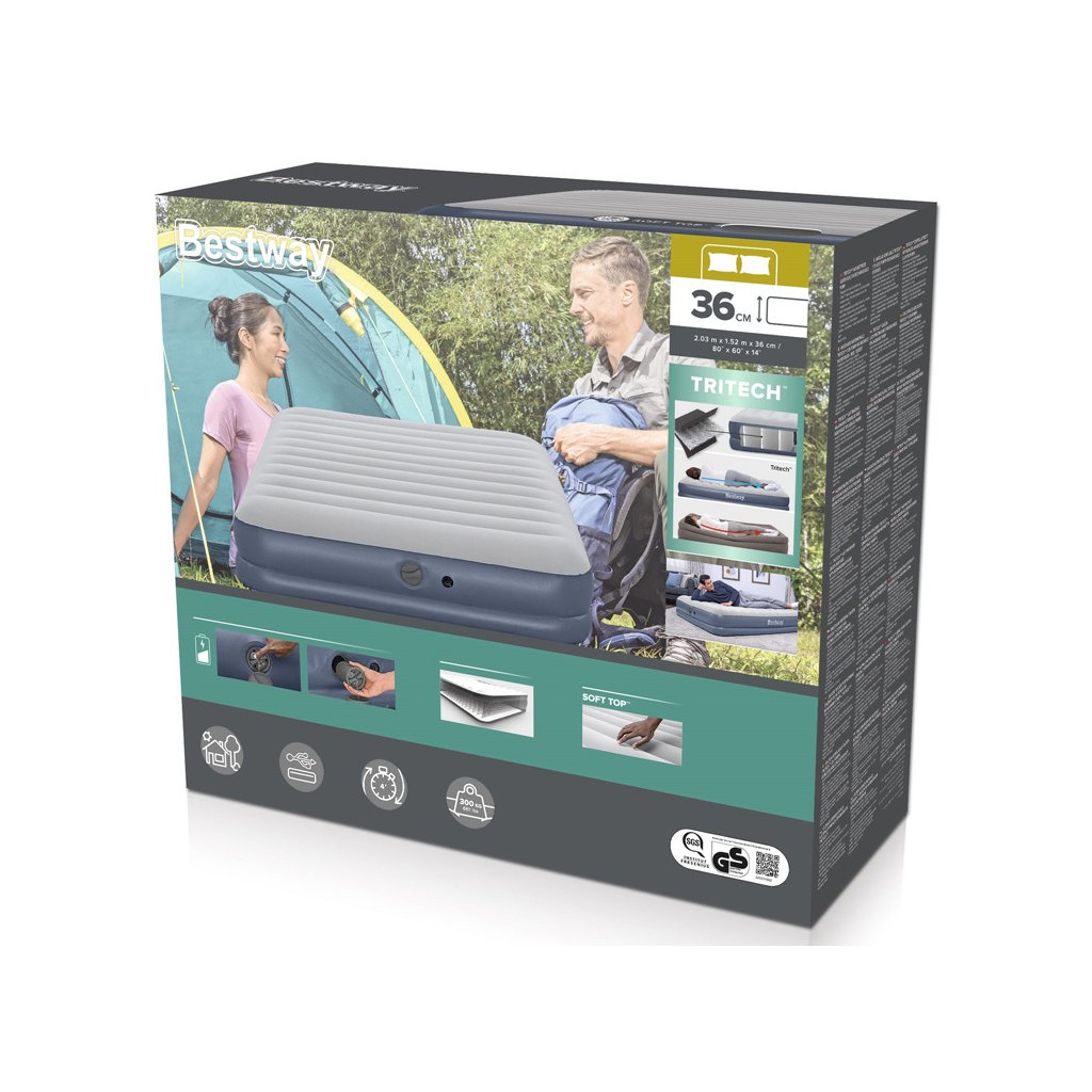 Dvojmatrac Tritech Air Mattress Queen Bestway je nafukovacia posteľ určená na vonkajšie aj vnútorné použitie, je teda výbornou alternatívou k náhradnému matracu a výborne sa hodí aj na relax, pláž, kempovanie alebo spanie vonku v stane. Na matrac s rozmermi 203 x 152 x 25 cm sa bez problémov zmestia dvaja dospelí. Vnútorná štruktúra matraca je vyrobená z materiálu Tritech™, ktorý zaisťuje odolnosť a pevnosť a zároveň umožňuje matracu zachovať si rovnaký tvar bez ohľadu na to, koľkokrát sa nafúkne a vyfúkne. Vnútorná pokroková technológia I-beam zabezpečí stabilitu matraca spojením spodnej a hornej časti povrchu matraca vodorovnými pásikmi. Veľkou výhodou matraca je vstavaná, odnímateľná batériová vzduchová pumpa, ktorá umožňuje rýchle automatické nafúknutie matraca a rýchle vyfúknutie vytiahnutím pumpy z matraca. Po vybratí je možné pumpu nabíjať pomocou priloženého USB kábla. Vrchná časť matraca je pokrytá mäkkým vinylovým materiálom.