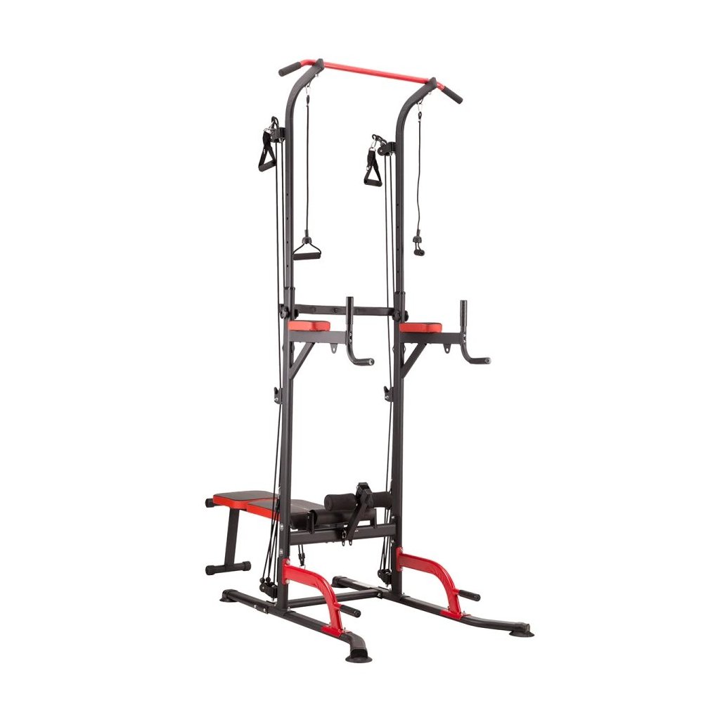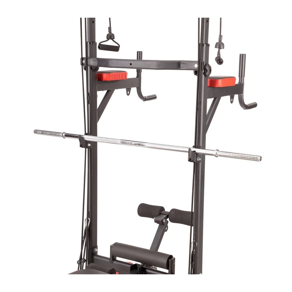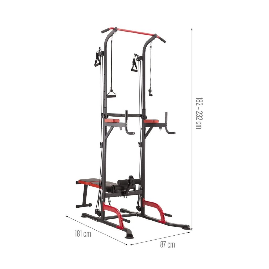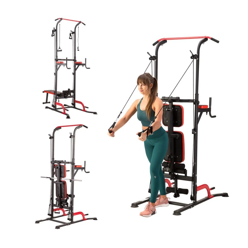 Multifunkčné zariadenie PWL8325 spája hrazdu, bradlá, hornú a dolnú kladku, podpery na kliky a nastaviteľnú lavičku, čím vytvára kompletnú domácu posilňovňu. Vďaka integrovanej nakladacej osi a držiaku na veľkú činku môžete trénovať aj bench press, čo z tohto zariadenia robí všestranného partnera pre rozvoj sily a svalovej hmoty.