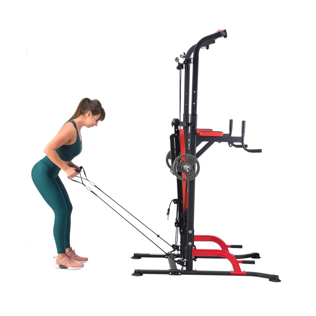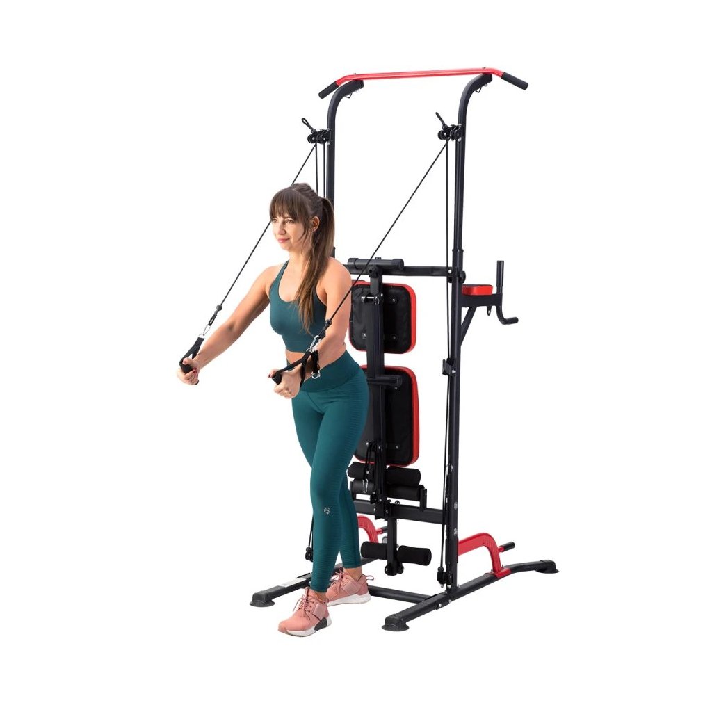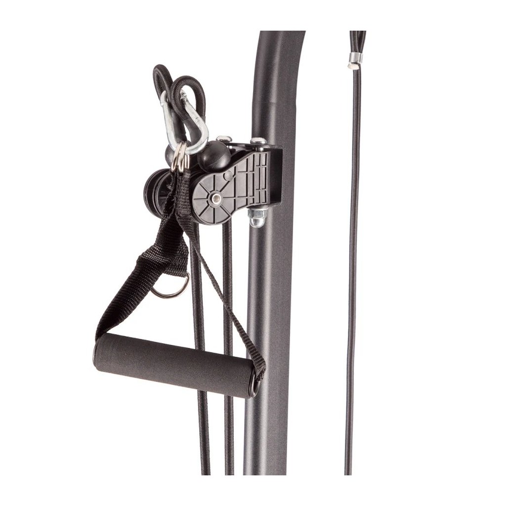 Súčasťou výbavy sú horná a dolná kladka, ktoré pracujú na princípe gumových odporových lán. Dajú sa pripevniť pomocou karabín a napnúť cez úchyty na ráme. Vďaka tomu viete simulovať tradičný lanový systém a trénovať široké spektrum cvikov – ako sťahovanie hornej kladky na chrbát, príťahy spodnej kladky na chrbát alebo ramená, tricepsové stláčanie a mnoho ďalších.