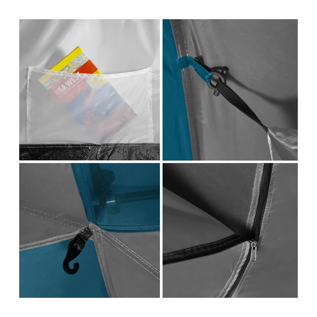 - Intuitívna konštrukcia: Stan sa stavia pomocou 4 sklolaminátových tyčí, ktoré sa ľahko rozlišujú vďaka farebnému označeniu tunelov a koncov tyčí. Dve spálne sa zavesujú do postaveného tropika pomocou špeciálnych úchytov a celá konštrukcia sa vypína pomocou napínacích laniek a kolíkov.