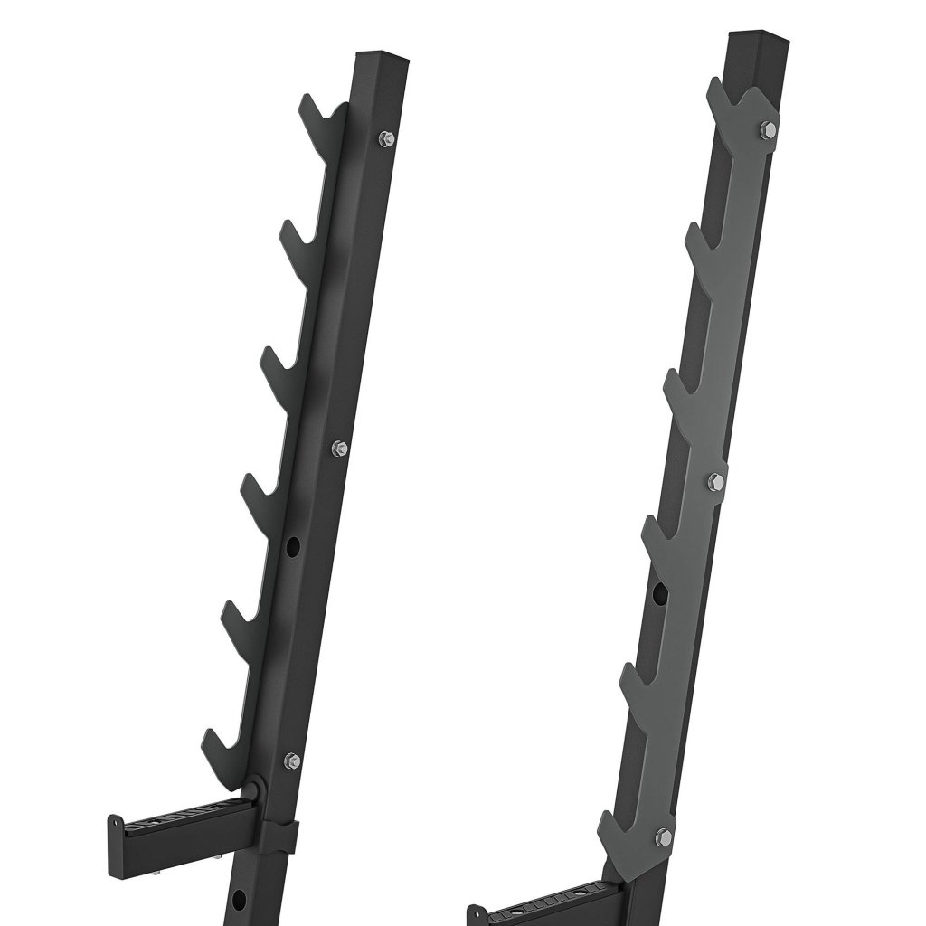 Háky na činku sú tvarované tak, aby umožnili bezpečné a pohodlné odloženie. Činku môžete odložiť ako po dokončení série, tak aj počas cvičenia, kedy je potrebná dodatočná opora. Vďaka 6 úrovniam je možné ľahko prispôsobiť výšku štartovej pozície, pričom optimálne rozostupy medzi hákmi zaručujú komfort pri zdvíhaní a odkladaní činky.