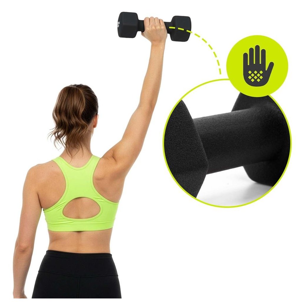 Činky sú vyrobené z liatinového jadra s odolným neoprénovým povrchom, ktorý je príjemný na dotyk, protišmykový a šetrný k podlahe. Farebné rozlíšenie hmotností umožňuje rýchlu orientáciu pri výbere správnej záťaže.