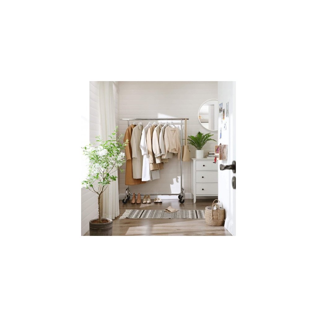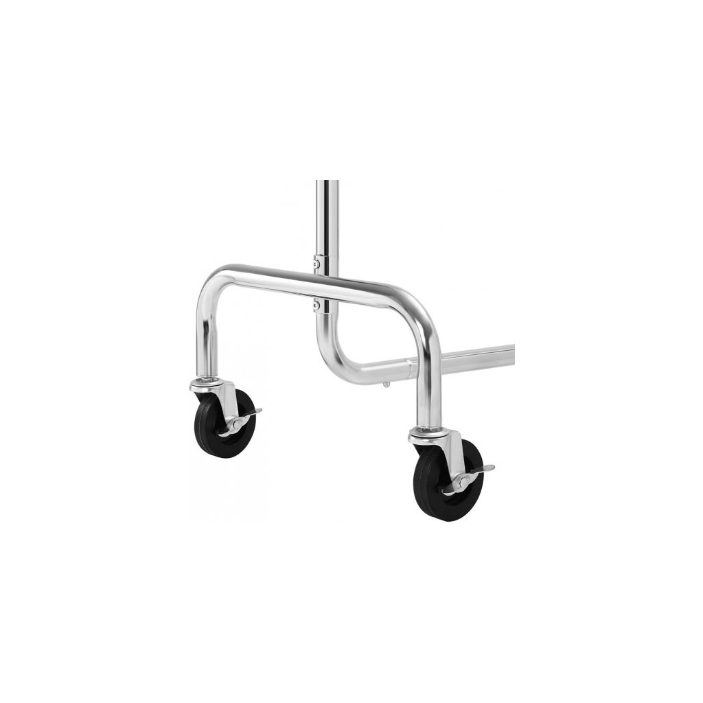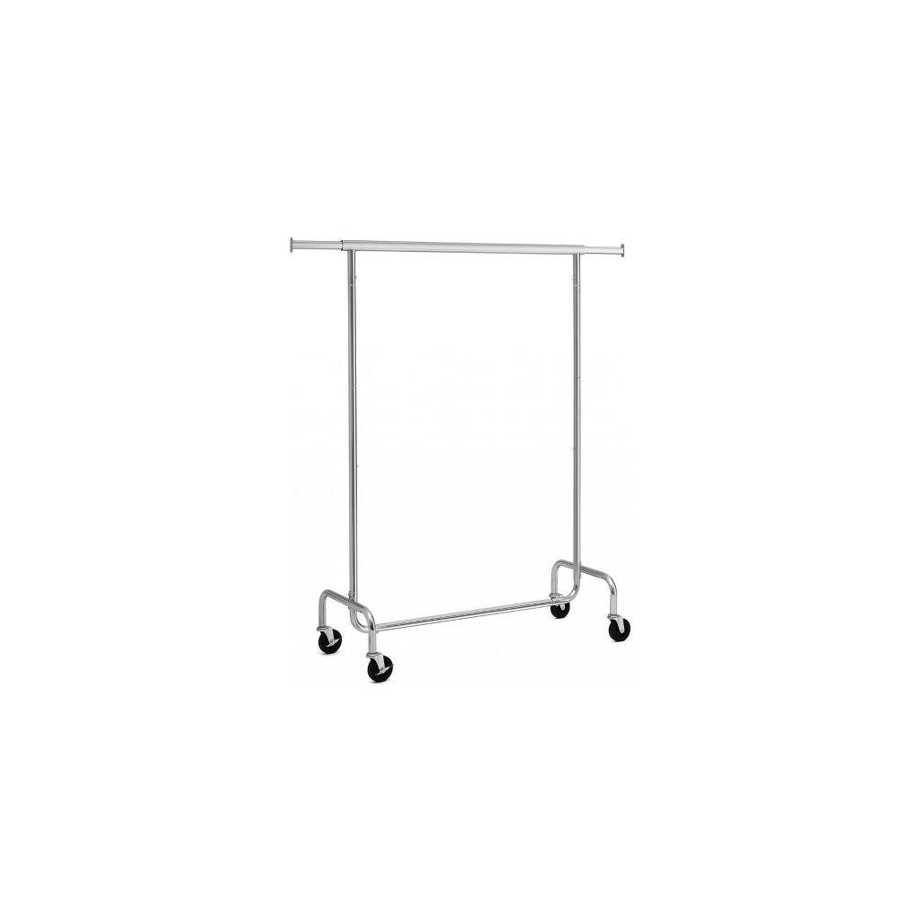 Máte veľa oblečenia a nemáte ho kam dať? Stačí oblečenie zavesiť na ramienko a následne na vešiakovú lištu. Stojan je vyrobený z pochromovaného materiálu, ktorý je vodeodolný a antikorózny. Horný priečnik je možné vysunúť na obidve strany v rozmedzí 110 cm až 150 cm s maximálnym zaťažením 130 kg. Výhodou stojana sú aj 4 otočné kolieska o 360° s brzdami (2 kolieska), ktoré umožňujú rýchly prenos vášho oblečenia. Stojan je vhodný do domácnosti ale aj do butikov.