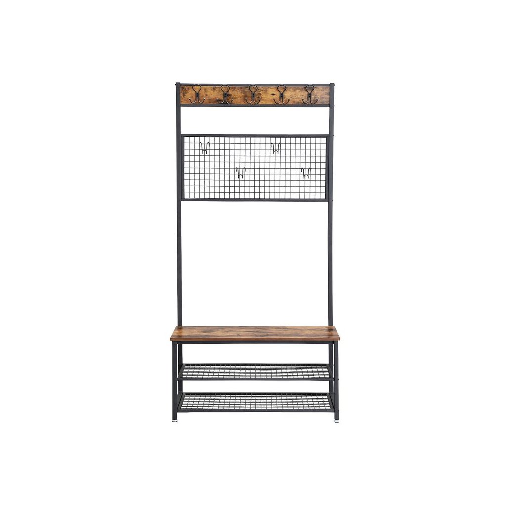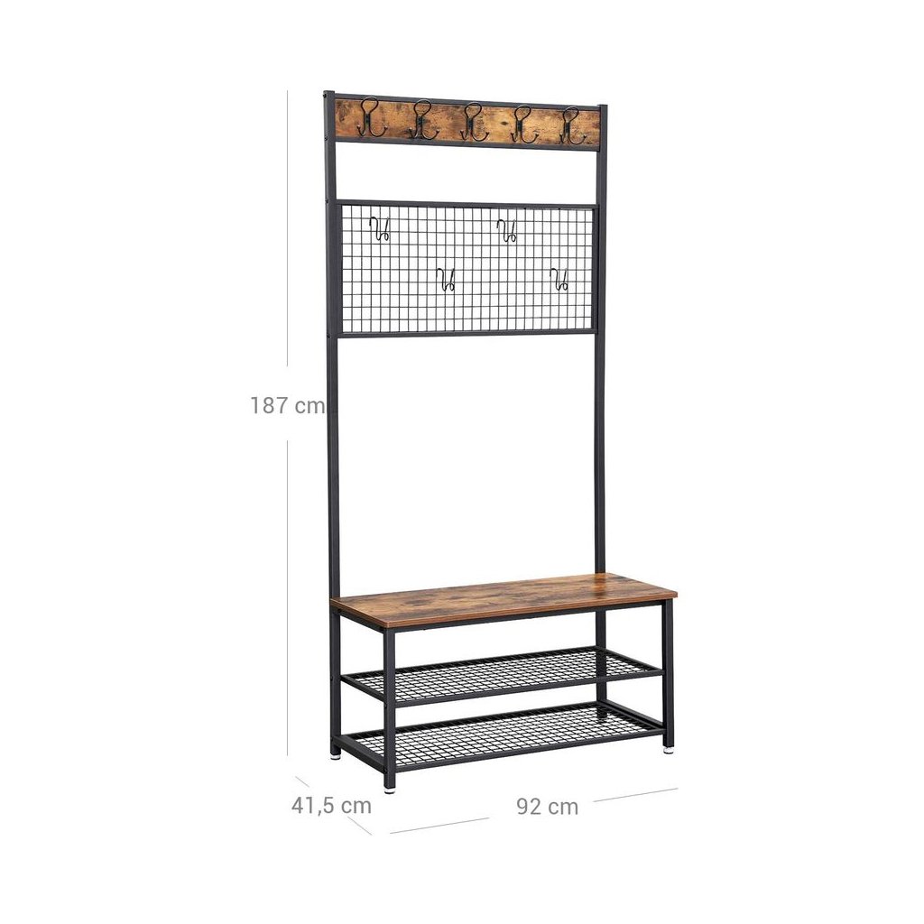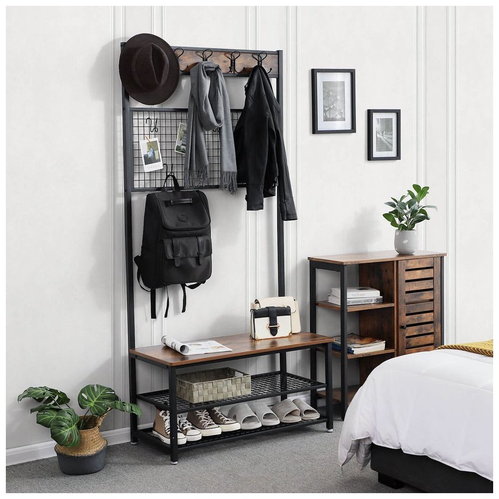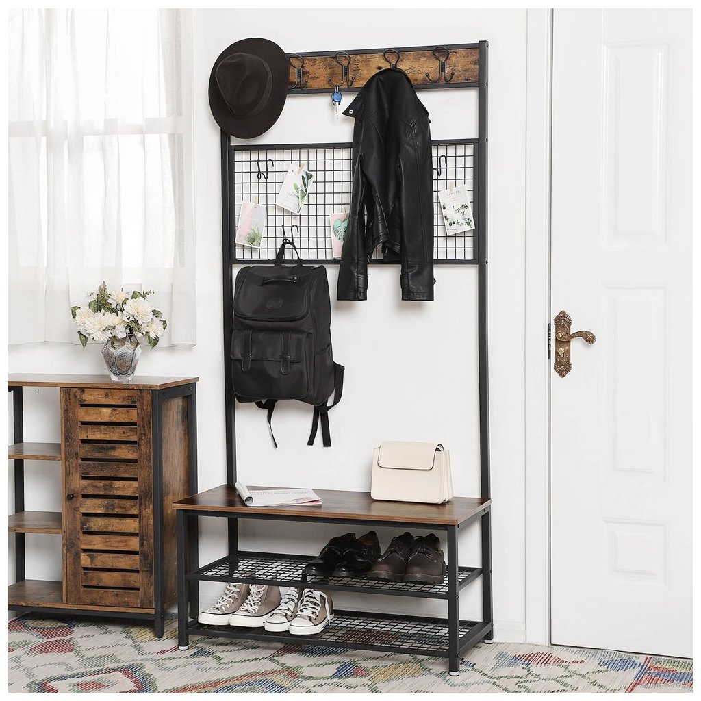 Odstráňte neporiadok na chodbe pomocou tohto inteligentného stojana na kabát a topánky, ktorý sa vyznačuje dokonalou rovnováhou čistých línií, modernou eleganciou a rustikálnym pôsobením. Po návrate domov stačí zavesiť kabát, čiapku a šál na niektorých z 5 dvojitých háčikov, posadiť sa na lavicu a vyzuť si topánky. Na odkladanie topánok slúžia dve kovové police s nosnosťou 20 kg. Stredný panel s mriežkou dodáva stojanu na kabáty osobitný vzhľad. Môžete ho použiť na pripnutie fotografií, poznámok, pohľadníc alebo dokonca ako organizátor náušníc. Na kovovom strednom panely sa nachádza tiež 5 háčikov, ktoré môžete použiť na zavesenie napr. kabeliek.