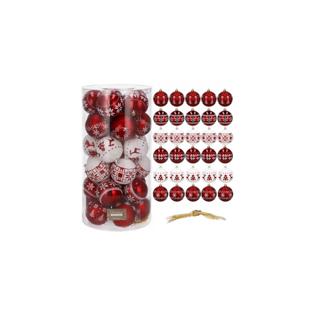 Táto sada obsahuje celkom 30 ozdôb s priemerom 7 cm, čo je ideálna veľkosť pre rôzne typy vianočných stromčekov. Gule sú ozdobené jemnými bielymi a červenými vzormi, ktoré vytvárajú harmonický a štýlový vzhľad.