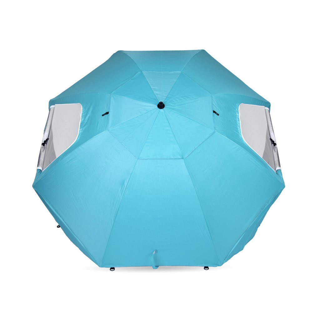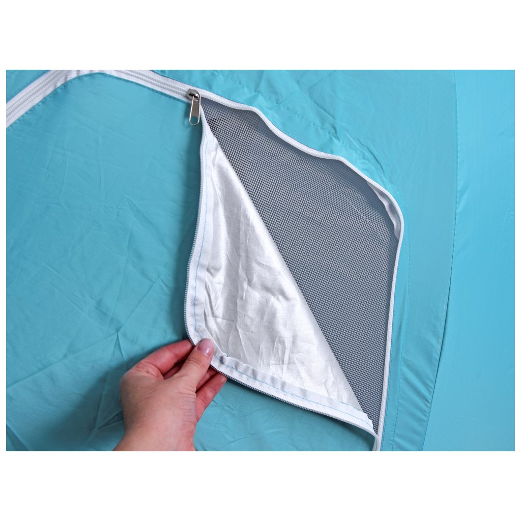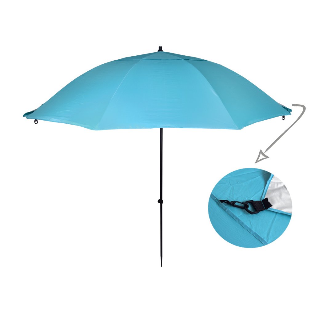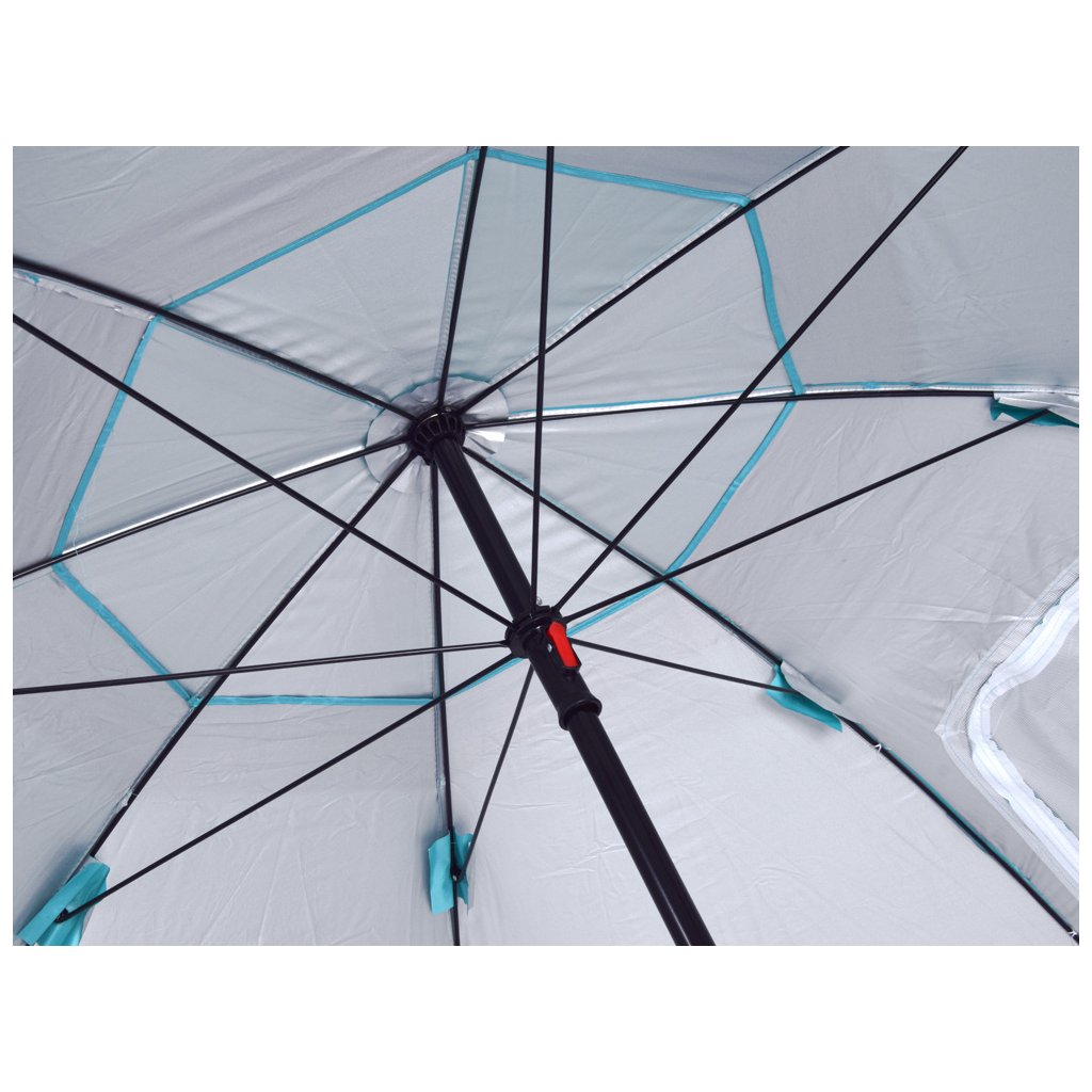 Dáždnik je vyrobený z najkvalitnejších materiálov, čo zaručuje jeho odolnosť a spoľahlivosť. Vybavený pevným rámom a polyesterom s ochranným strieborným náterom účinne chráni pred UV žiarením a nepriaznivými poveternostnými podmienkami. Dáždnik má dve okná s moskytiérou a vetracími otvormi, ktoré zabezpečujú výbornú cirkuláciu vzduchu. Vnútorné vrecká navyše umožňujú uloženie nápojov, jedla a iných drobností.