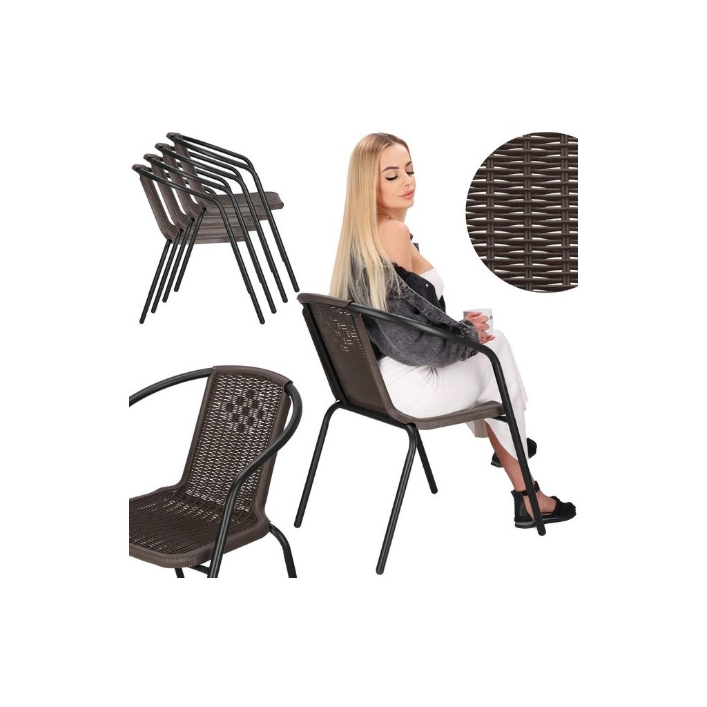 Vytvorte si ideálny priestor na relax a spoločenské chvíle s touto sadou štyroch hnedých záhradných stoličiek od Springos®. Kombinujú eleganciu, pohodlie a odolnosť, čím sa stávajú skvelou voľbou pre terasy, balkóny aj záhrady.